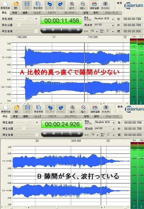 達人ならヨウカン切ったようなキレイな波形を描くけど、Aはオレ的には比較的うまく行った方。Bは無理な息遣いとか息が足りないとこんな不安定な波になる。