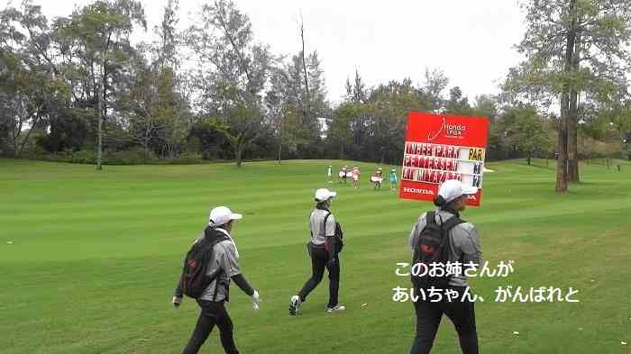次のホールに向かうスコアボード持ちのお姉さんと目が合い、お姉さんはボードを指さし「あいちゃんがんばれ」と日本語で言ってたね。