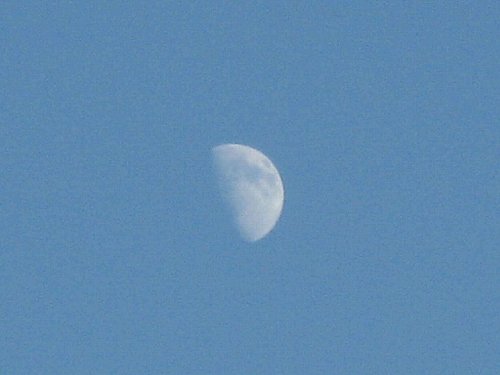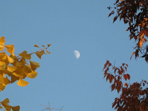 秋も深まり、紅葉真っ盛り。見上げるとお月さんが・・・最大ズームで撮ってみたら結構映っていた。