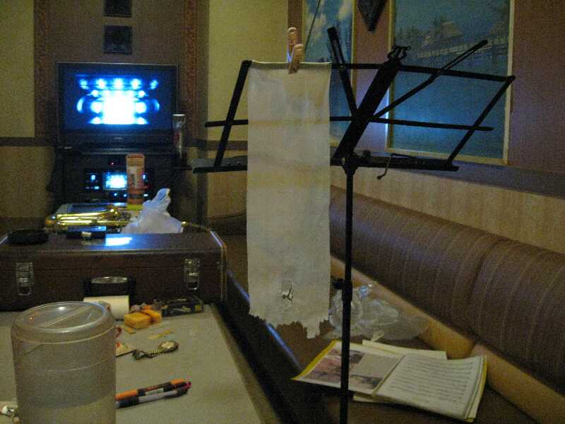 譜面台からトイレットペーパーを垂らし、息を吹き掛けてみると下の部分だけがゆらゆら。自分では真っ直ぐに吹いているつもりだったが、下向きだったのか。