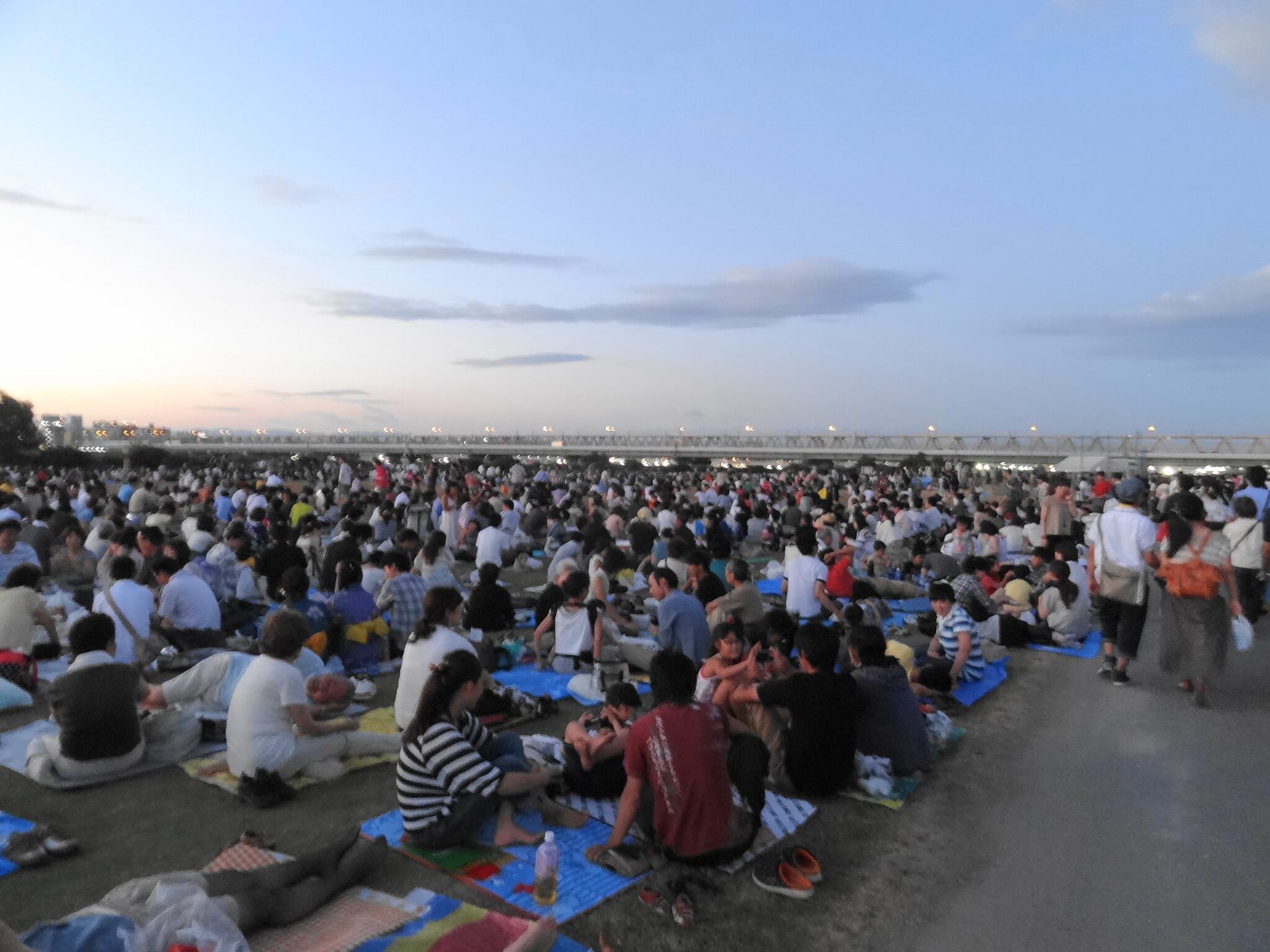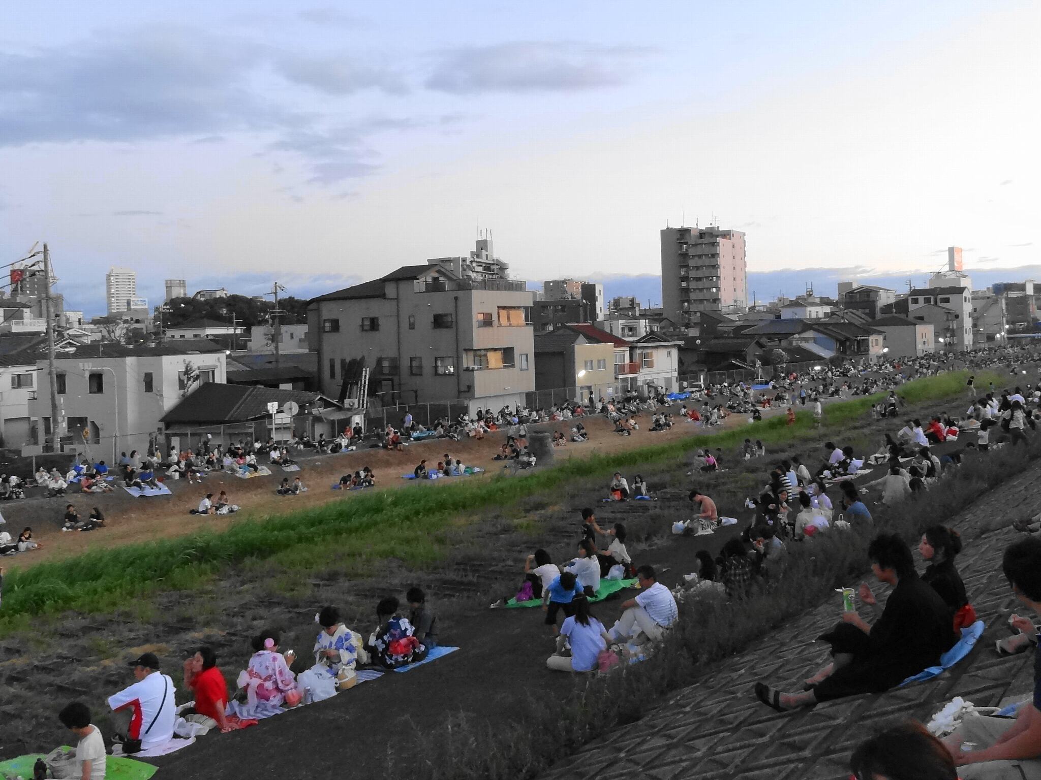 水面から打ち上がる全景を収める為に目的地は前方の阪神高速越えだけど、既にこの人出。