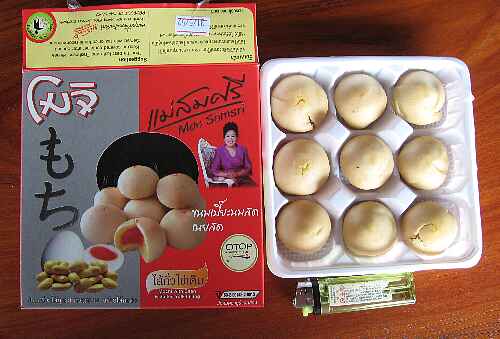 チャーン島からの帰路、ドライブインに立ち寄ったところ、土産コーナーでひらがなの「もち」と書かれた看板を発見。興味本位で店員に尋ねると売り場まで案内してくれた。うーん、外箱見た限りではこれは「もち」ではなく、饅頭のようだ。試しに一箱買ってみたが、味覚そのものもやっぱり饅頭だった。本物のもちとの違いを伝えると店員は、「これがタイではもちよ」、だって。日本語を入れたりすると高級品に見えるとタイ人から聞いた事あるが、このもどき品もそういうことか。