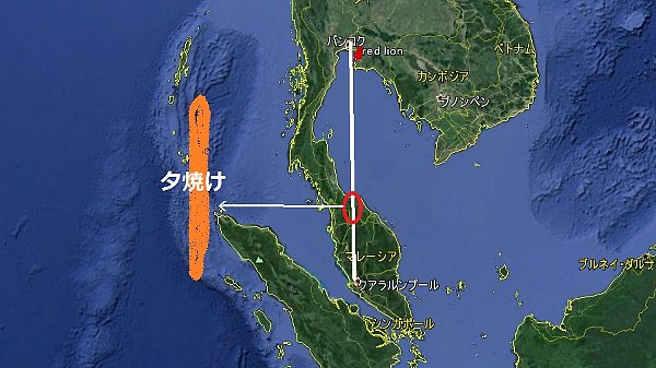 機内ではGPSが使えなかったが、経路、経過時間からしてアンダマン海方向ではないかと推測。