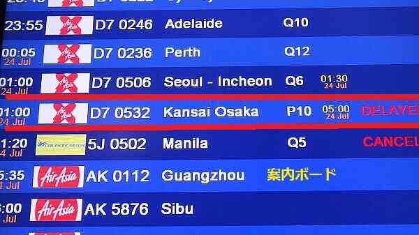 wifiに繋げるとメールが届いていて、エアアジアからの遅延発生の緊急連絡だった。
