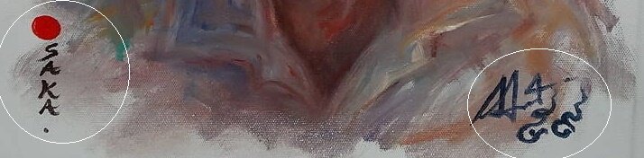 画左端は大阪のOを日の丸国旗とイメージ重ね、●sakaと入れた。右端はエムさんの画家としてのイニシャルと説明受けた。