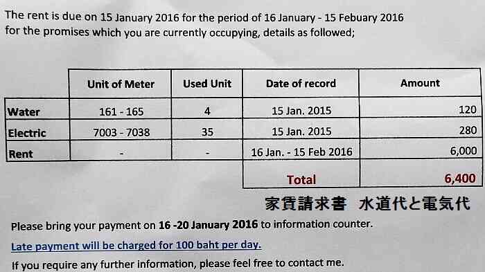 賃料6000B(約2万円)と、光熱費400B(約1400円)の合計6400B。