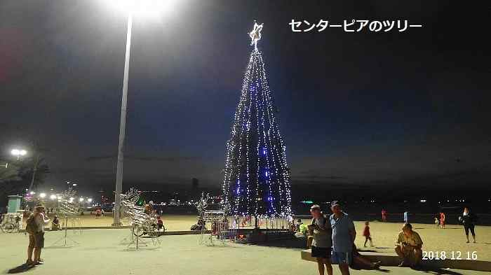 今時期ここパタヤでは朝の白み始めが6時半頃と日本と同じ。ただサンセットは17:50頃と日本より1時間は陽が長いが18時になると急激に暗闇に包まれる。夕飯前にビーチロード流すとセンターピアにクリスマスツリーが。その先にあるA-ONEホテルのツリー、これが一番見栄えがする。