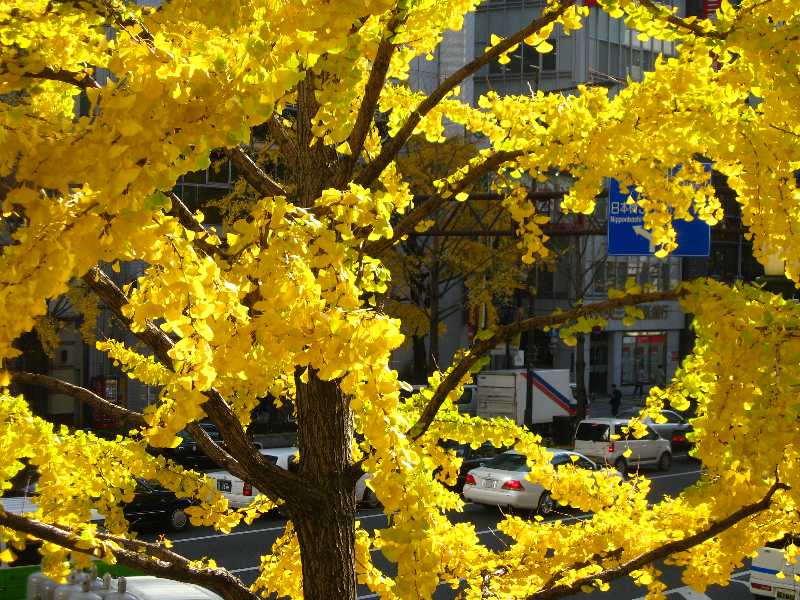 御堂筋のそれは殆ど枯れ落ちているが、ここだけはビル影の位置からか、今日現在もまだまっ黄黄。